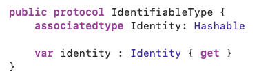 Equatable은 익숙하시니, IdentifiableType 설명만 하자면, associatedtype으로 Hashable 프로토콜을 채용하는 identity 프로퍼티가 있다. 그리고 이걸 우리의 모델에서 준수해줘야 한다. 위의 예제에서는 String이 Hashable, Equatable 모두를 준수하고 있으므로 다른 추가 구현필요 없이 IdentifiableType의 모든 요구사항을 준수했다.
