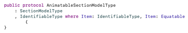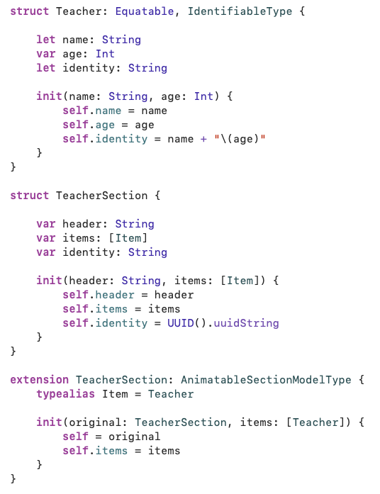 이 프로토콜은 일전에 보았던 SectionModelType과 추가로 위에서 준수했던 IdentifiableType을 채용하고 있다. 그리고 제한사항으로 Item(Teacher)이 IdentifiableType과 Equatable을 준수하도록 제한한다. 이미 이건 우리가 위에서 구현했으니, TeacherSection에서만 IdentifiableType을 준수해주면 된다. 그렇게 SectionModelType과 IdentifiableType를 채용했다면, AnimatableSectionModel 작업은 끝이다.