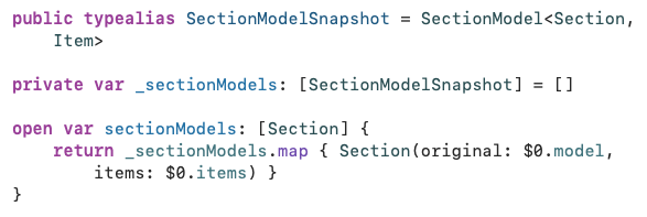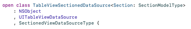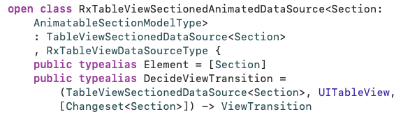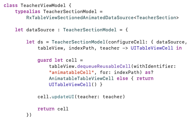 자 이제 우리가 만든 AnimatableSectionModel로 dataSource를 만들어보자. 필자는 이름이 너무 길어서 이름을 바꾸고 진행했다.
