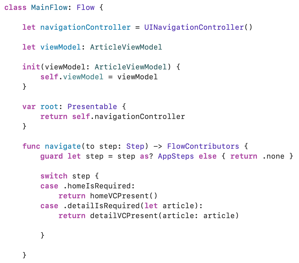 navigate에서 실행할 함수는 위와 같습니다. 지난 AppFlow와 다른 점은 이제서야 Scene을 띄워주기 위한 작업을 시작했다는건데요. 원래하시던대로 구현을 하시면 됩니다. 이 Flow에서 원하시는 ViewModel을 주입하는 것, 데이터를 전달하는 것 등을 구현하시면 됩니다. 당연한 이야기겠지만 여기서 navigationController는 root에서 사용한 것을 공유하셔야 합니다. 새로 만들거나 UINavigationController(rootViewController: ~)를 사용하시면 작동하지 않습니다. 마지막으로는 FlowContributors를 리턴하는 것인데요. 예제에서는 none으로 아무런 트리거도 일어나지 않게 했습니다. 자, 그렇다면 위의 navigate 메소드에서는 어떤 case가 작동할까요? 이건 우리가 전 FlowContributor에서 파라미터로 넣은 Stepper에 의해서 작동합니다. 이걸 알아봅시다.