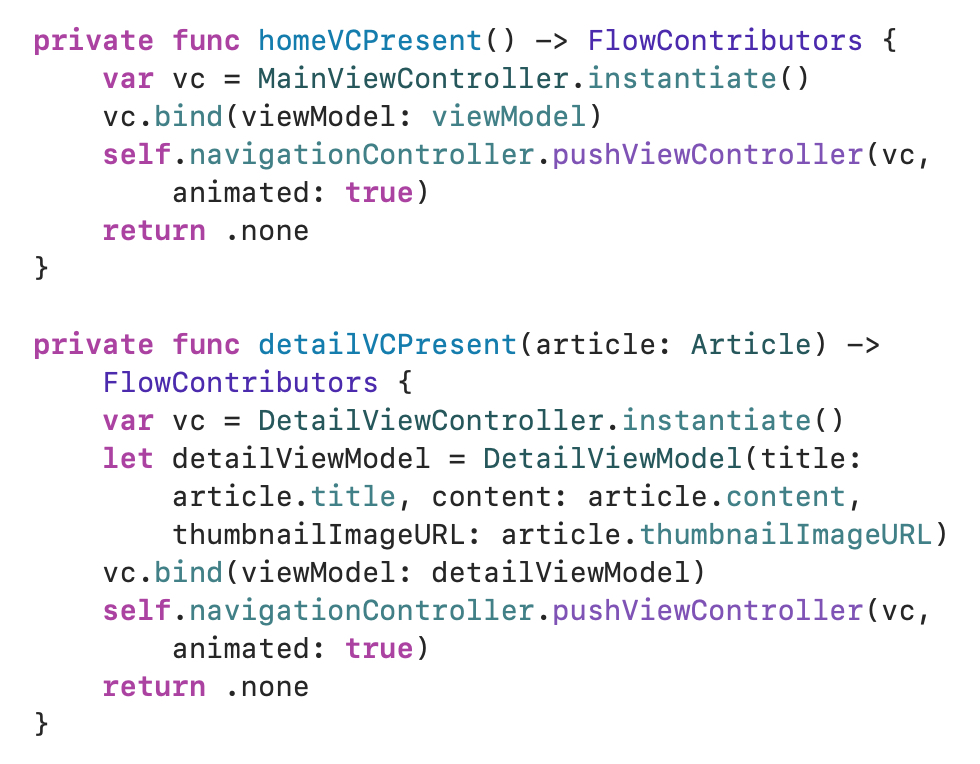 우리가 새롭게 도착한 Flow는 root를 UINavigationController를 가지고 있습니다. 그렇다는건 앞으로 이 Flow는 navigationBar와 push, pop로 화면 전환을 하게 된다는 의미죠. 나머지는 똑같습니다:) 저는 DetailViewController에 article을 전달하는 방식으로 구현했기 때문에 assciatedValue로 Article을 주었습니다.