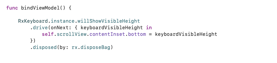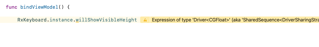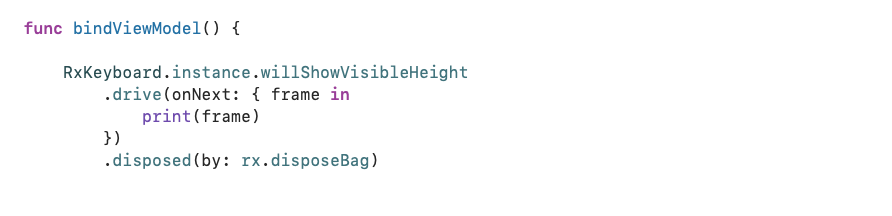 2) 위 이미지처럼 RxKeyboard에 접근합니다. instance를 통해 객체에 접근해서 관련한 세 가지 Driver를 사용할 수 있습니다. 저는 3번을 하기로 했기 때문에 willShowVisibleHeight로 구현했습니다. 테스트를 한 번 해볼까요?